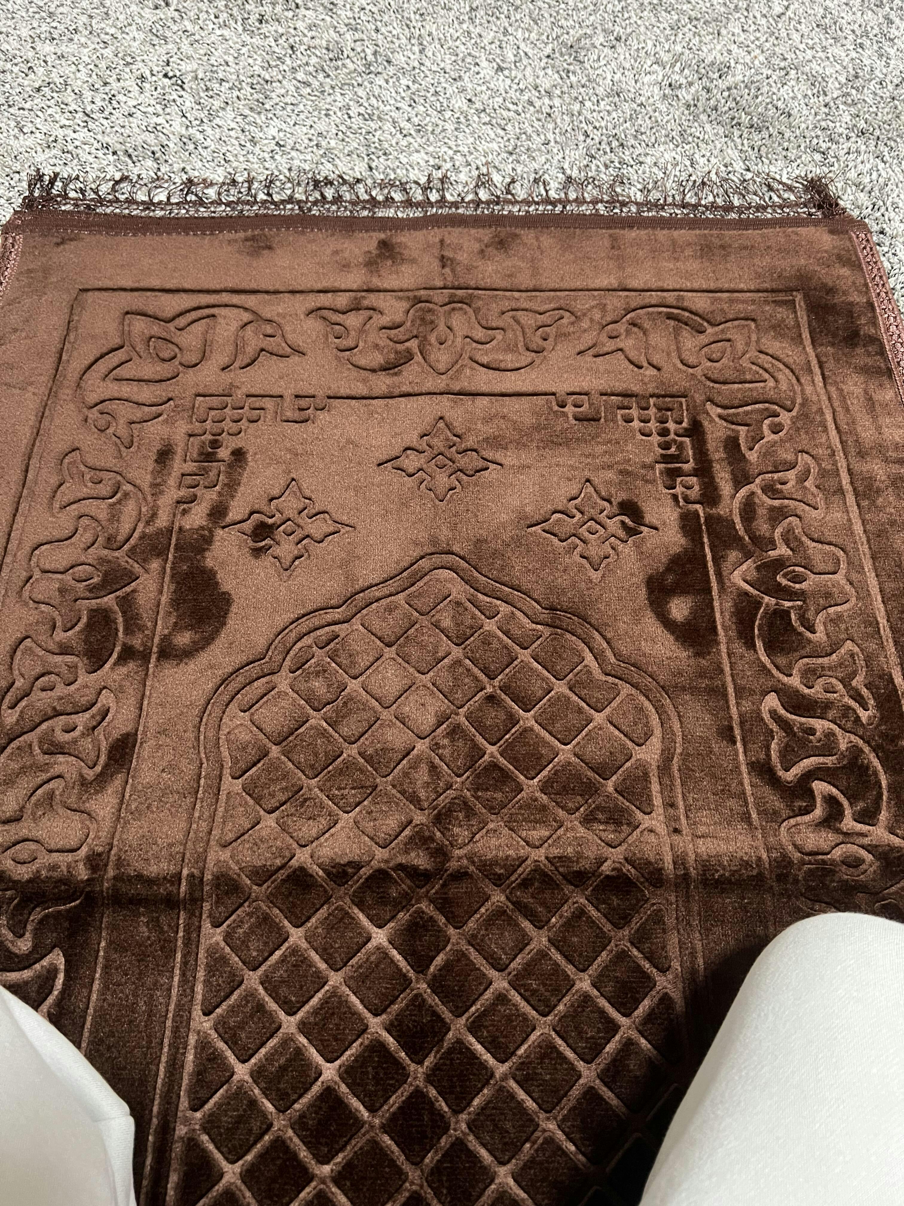 Elevate your prayer space with the Premium Brown Prayer Mats, designed to blend luxurious comfort with timeless style. Crafted from velvet plush fabric, each mat offers a soft, gentle cushion for your knees while adding a warm, elegant touch to your salah.