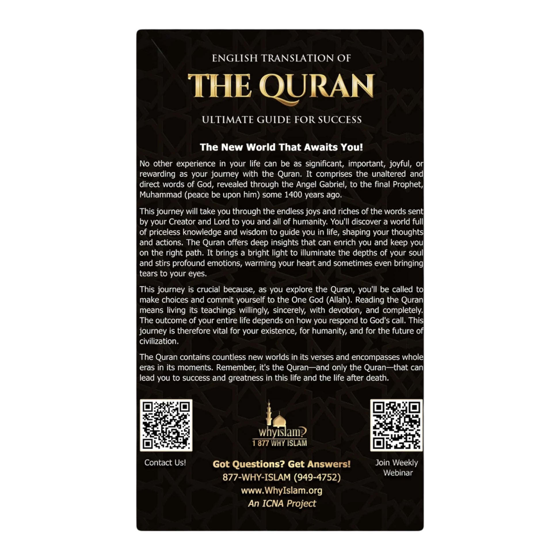 This English Translation of The Quran is your ultimate guide for success, offering the unaltered words of Allah revealed to Prophet Muhammad ﷺ over 1,400 years ago. It takes you on a life-changing journey filled with wisdom, peace, and purpose — guiding your thoughts, actions, and heart toward truth. With clear, easy-to-read text and a powerful message of faith, this Quran helps you understand and live by Allah’s guidance, bringing light to your soul and success in this life and the next.